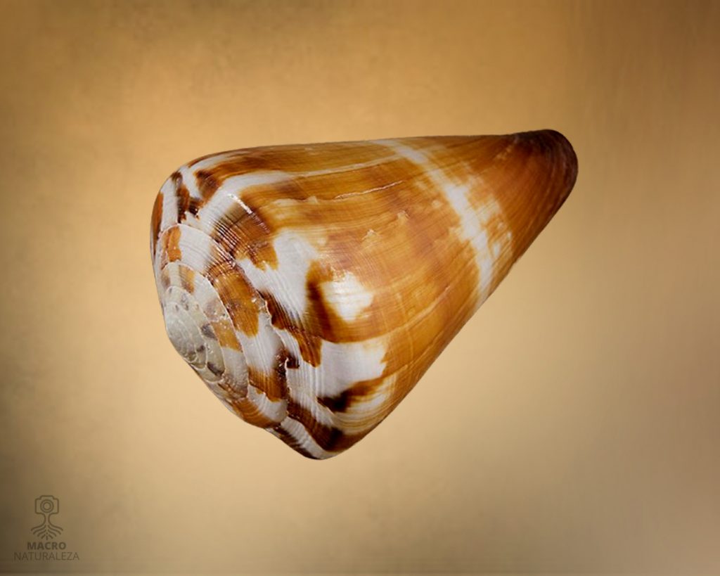 El Conus vexillum, conocido como “cono bandera”, es un molusco gasterópodo de la familia Conidae que puede alcanzar entre 10 y 15 cm de longitud. Su elegante concha cónica, robusta y de gran tamaño, lo convierte en una de esas joyas del mar que cautivan a primera vista.
