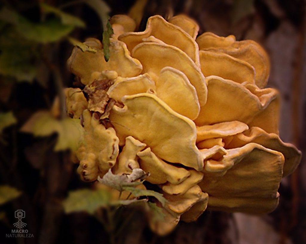 Su crecimiento comienza como una pequeña protuberancia adherida al tronco, que poco a poco se expande formando estructuras en forma de abanicos superpuestos, creando un conjunto llamativo y fácilmente reconocible. Su color, que varía según la humedad, oscila entre el amarillo azufre y el naranja intenso, con una textura suave similar a la gamuza.